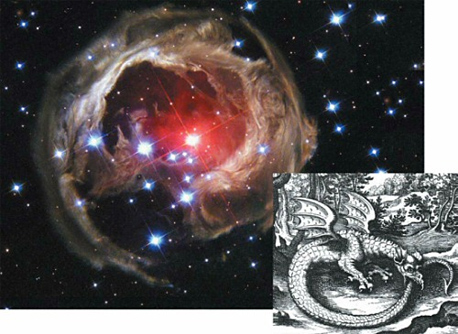 Variable star V838 Monocerotis (Greek for “unicorn”), a nova-like variable star, and its unusual surrounding “light echo” lies near the edge of the Milky Way Galaxy about 20,000 light-years from the sun (left). Credit: NASA and the Hubble Heritage Team (AURA/STScI). An alchemical engraving of an ouroboros devouring its own tail from an engraving by Lucas Jennis in De Lapide Philosophico. Published 1635 CE (right). Source: Wikipedia, Ouroboros.