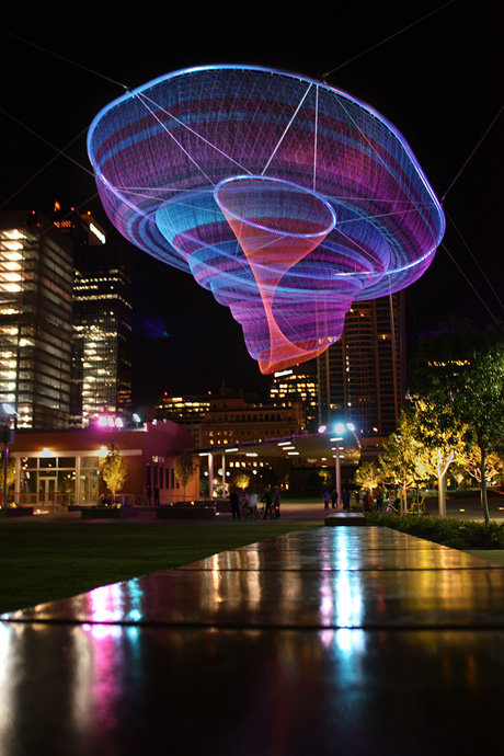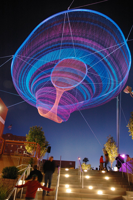 This project makes visible to the human eye the patterns of desert winds. During the day, sunlight projects patterned shadow drawings onto the ground and pedestrians on their daily paths. At night, the colored illumination gradually changes color through the seasons. The large three-dimensional multi-layered form is created by a combination of hand and machine knotting of recyclable high-tenacity colored polyester that is replaced in new color variations at intervals.